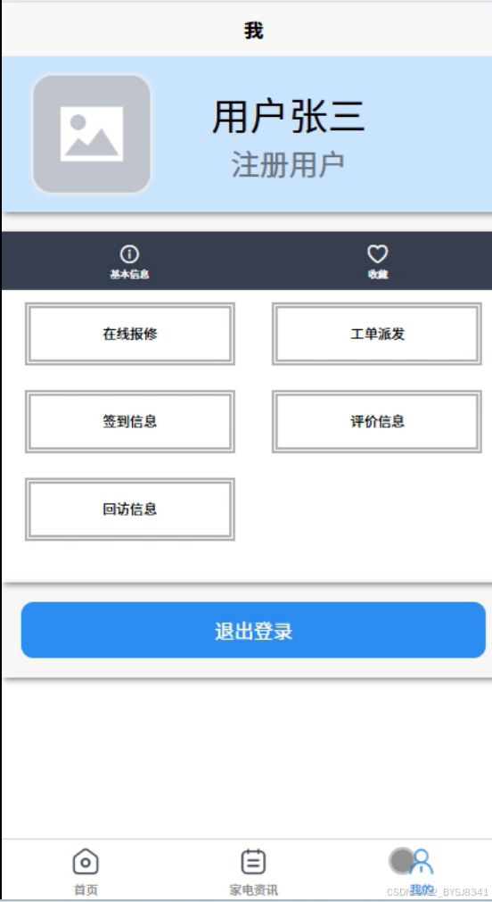 用户可以查看和管理个人信息,查看自己提交的报修记录、收藏的内容、工单状态、评价反馈和回访信息,方便追踪自己的维修历史和服务质量。我的界面如图5-5所示。