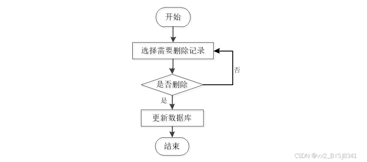 用户首先选择需要删除的记录,然后系统判断是否执行删除操作。如果用户选择不删除,则返回重新选择;如果选择删除,则更新数据库完成记录删除操作,最后结束流程。如图3-7所示。