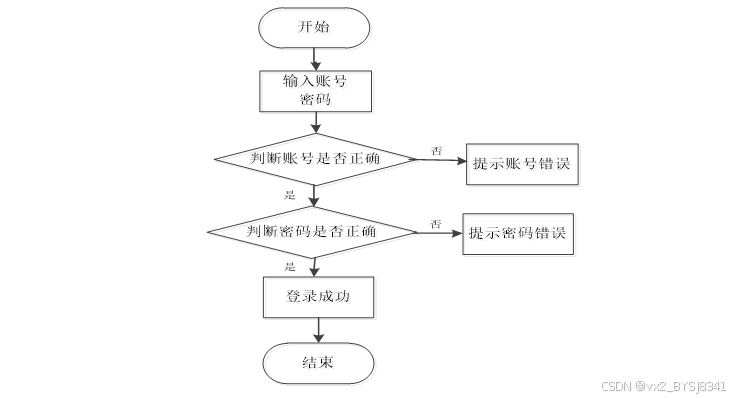 用户输入账号和密码后,系统首先判断账号是否正确,若不正确则提示“账号错误”;如果账号正确,则继续判断密码是否正确,若密码错误则提示“密码错误”;若账号和密码均正确,则显示“登录成功”,最后结束流程。如图3-5所示。