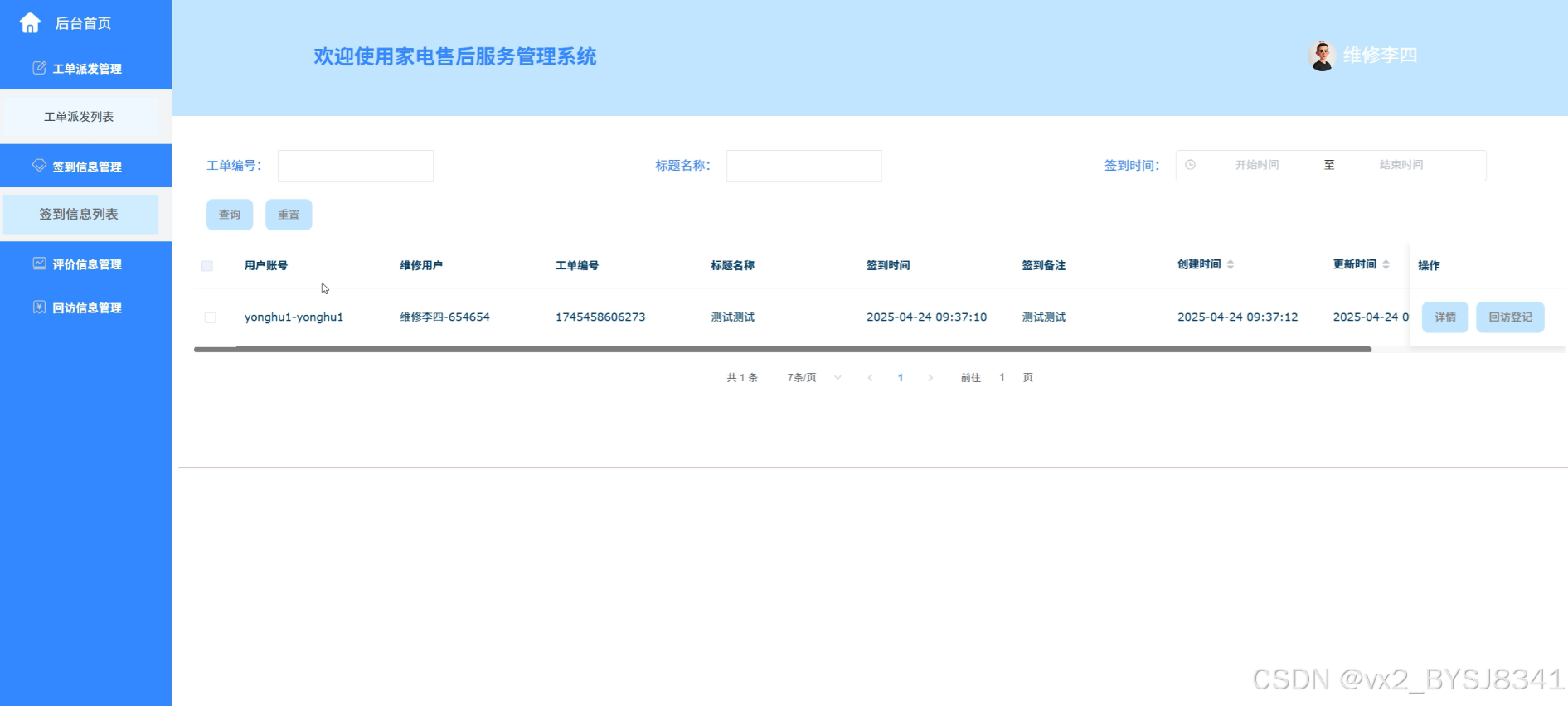 签到信息管理:管理员可以查看所有维修用户的签到记录,确保维修人员按时到岗,且可跟踪签到情况,确保维修人员的出勤与工作状态。