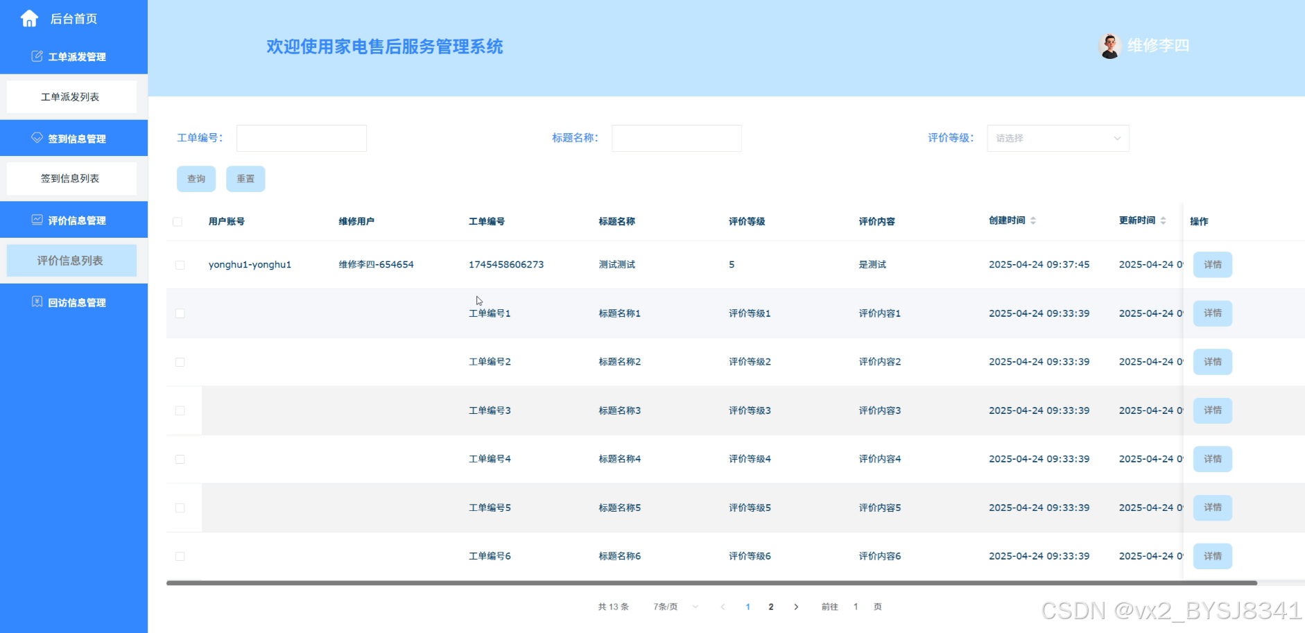 维修用户可查看客户对其服务的评价,了解自身服务的优缺点,并可根据评价不断改进自身的维修服务水平。管理员可以查看用户对维修服务的评价,处理不当评价或反馈,保证评价信息的真实性和公正性,以提升服务质量与平台信誉。评价信息管理界面如图5-12所示。