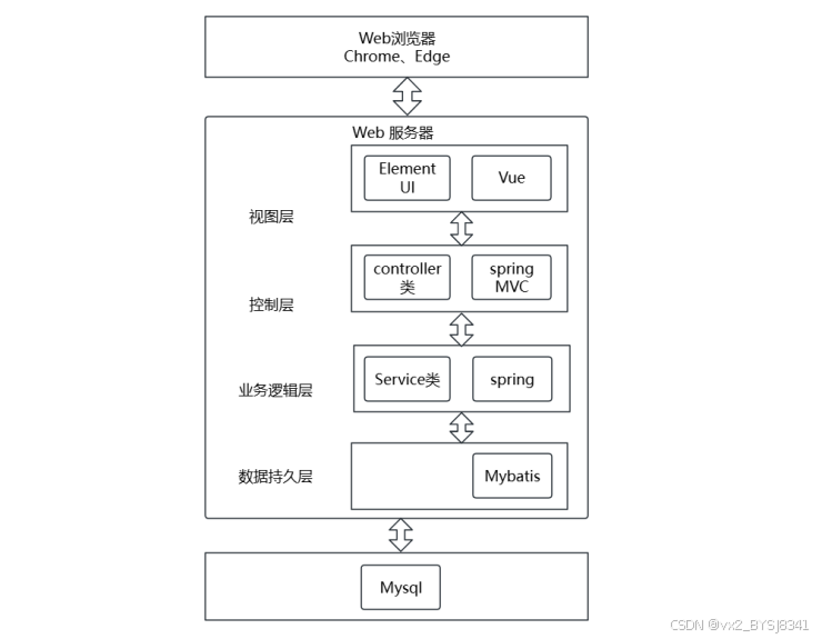 本项目采用B/S架构,遵循MVC设计思想,采用前后端分离的方式进行架构搭建。系统主要由表示层、控制层、业务逻辑层和数据层构成,整个系统架构如图4-1所示。