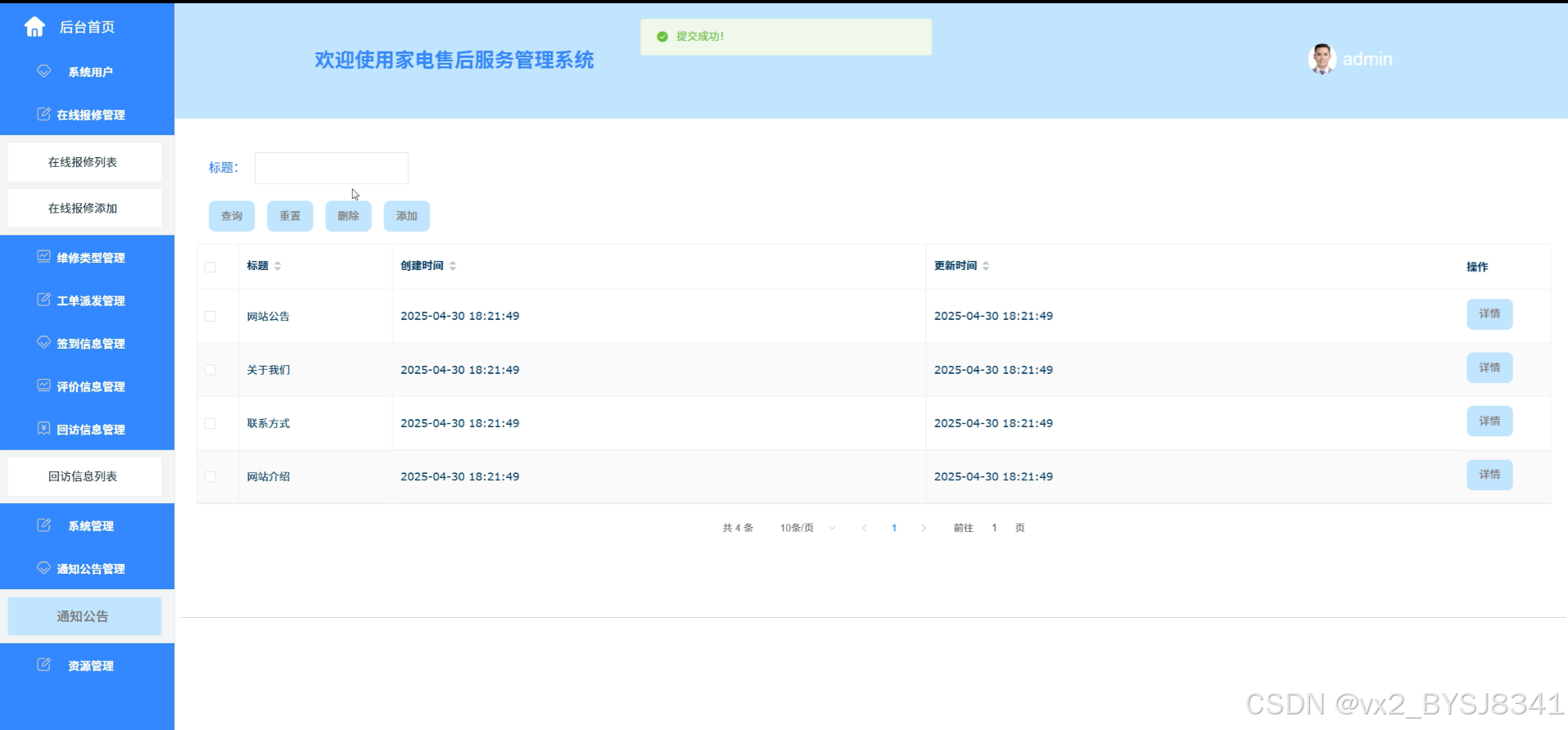 通知公告管理:管理员可发布全平台的通知公告,管理公告的接收范围、显示时长等,确保及时传达平台的最新信息或重要提醒。