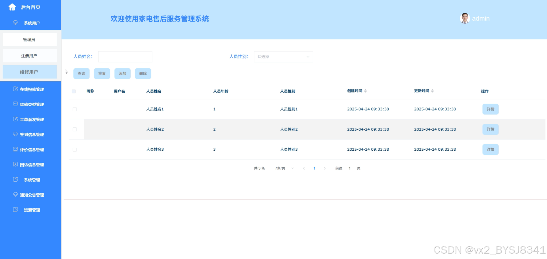 系统用户管理:管理员可对平台上的所有用户(管理员、注册用户、维修用户)进行管理,包括账号创建、修改、禁用或删除操作,确保每个用户的权限与角色符合其身份,维护系统的安全性与秩序。