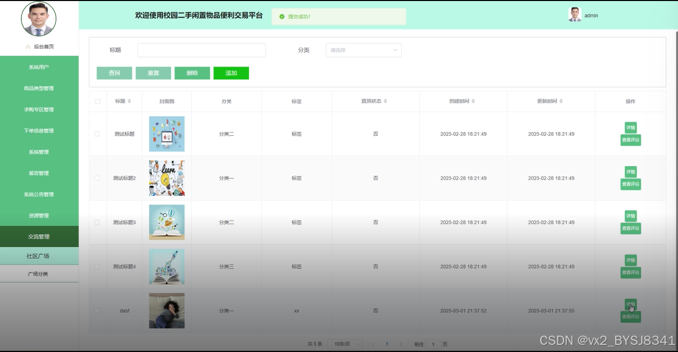 管理员点击“交流管理”这一菜单会显示社区广场和广场分类两个子菜单,管理员可以管理平台上的社区广场,设置广场分类,审核广场中的帖子和评论,确保内容的健康与有序。社区广场界面如下图所示。
