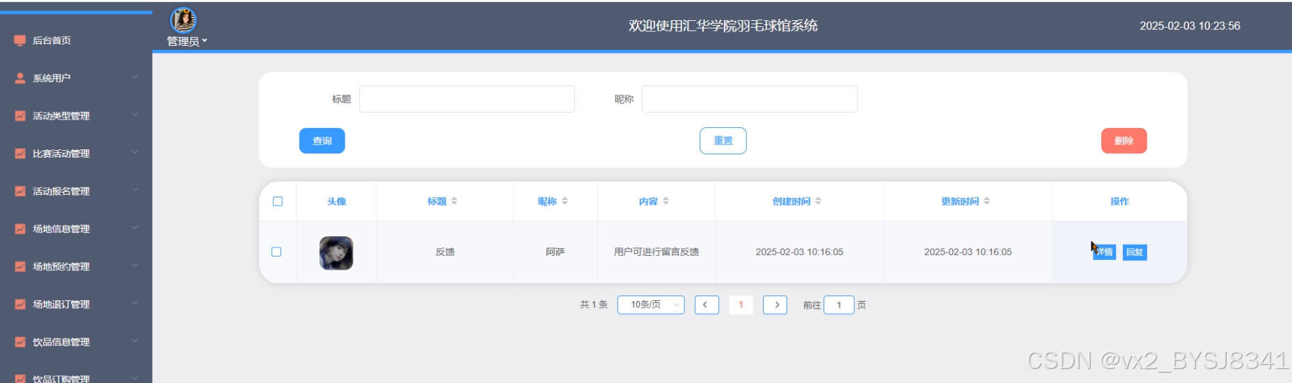 - 留言管理:管理员可以查看用户反馈列表中某个用户提交的反馈信息详情并进行回复,可以对列表信息进行查询、重置和删除操作。
