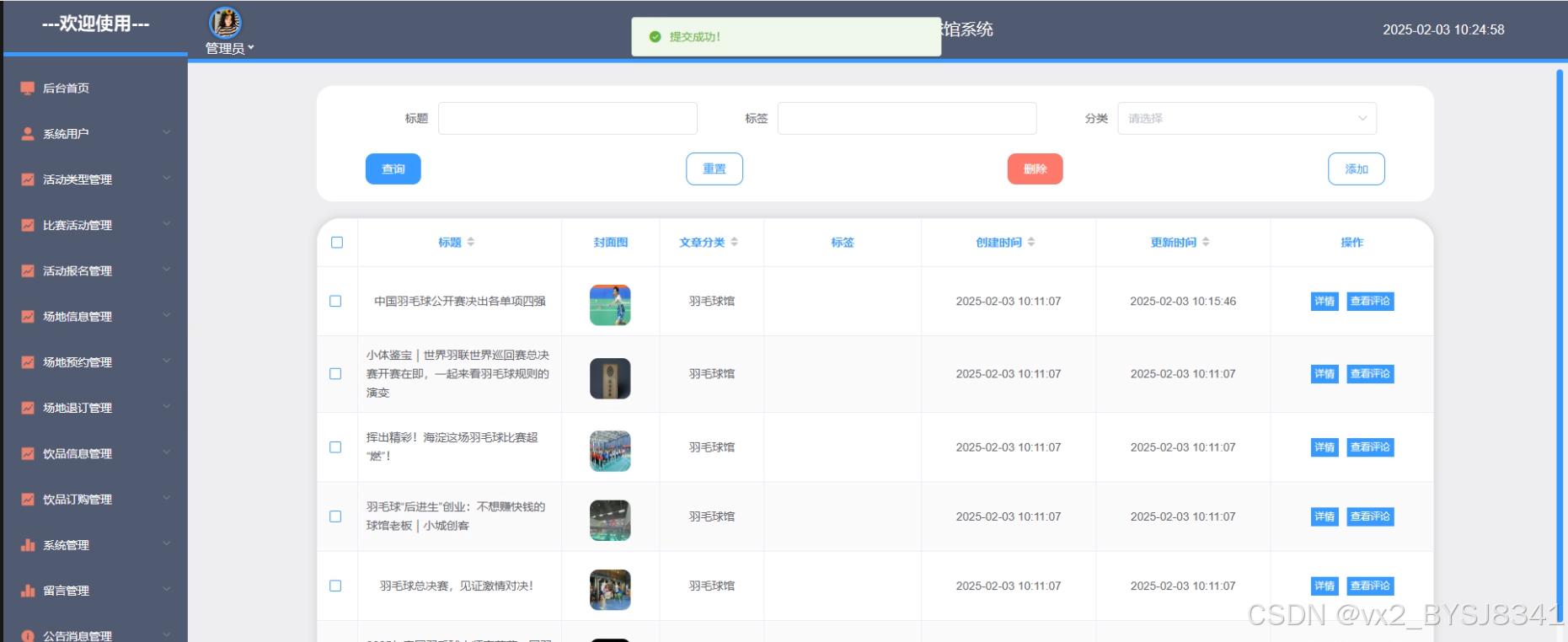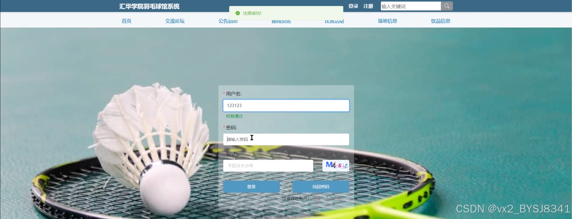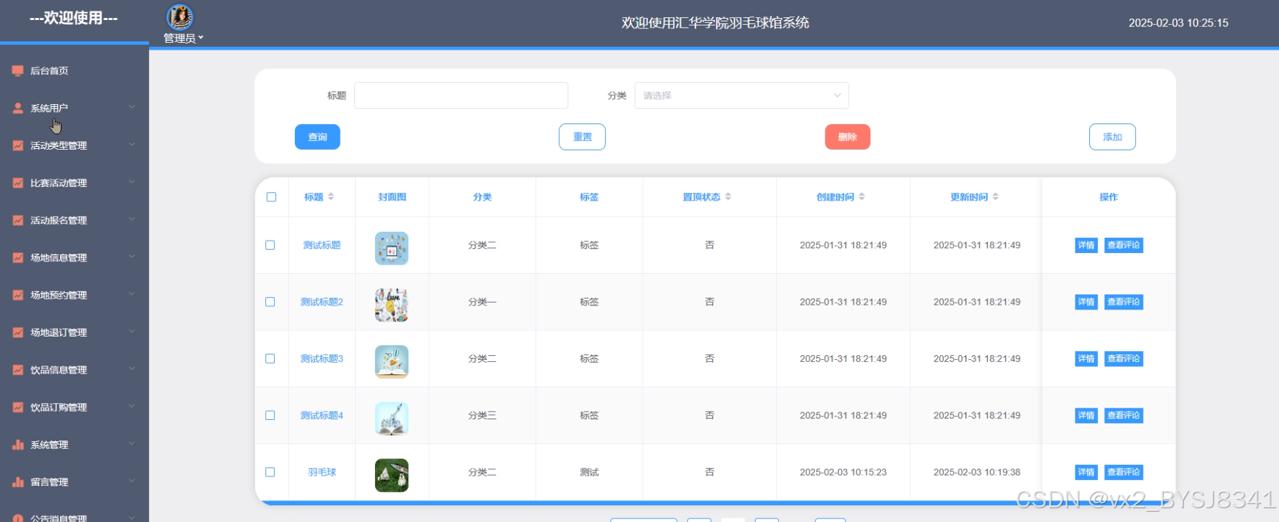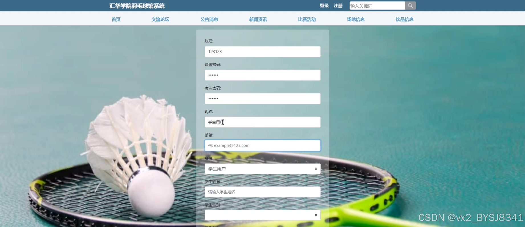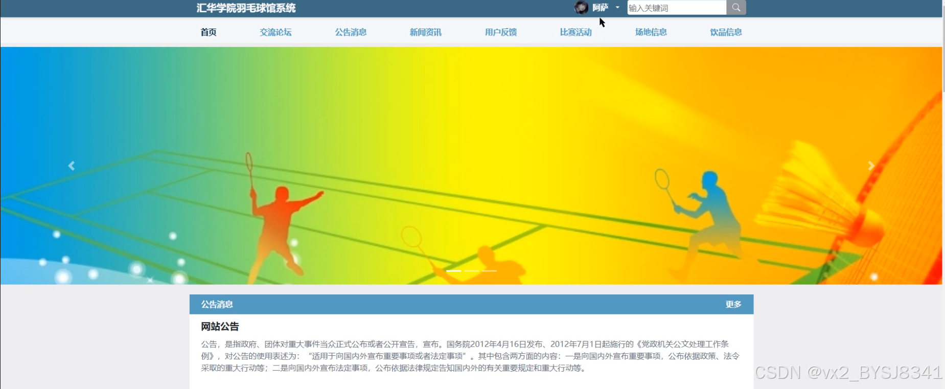 The system aims to optimize the management and usage process of badminton halls through digital means, improve resource utilization efficiency and service quality. Student users can enter the system by registering and logging in, view carousel images, news and information, announcement messages, and recommended competition activities on the homepage, and perform corresponding operations. The system also provides functional modules such as communication forums, competition activity registration, venue reservation, and beverage ordering to meet the diverse needs of users. For example, users can submit feedback online, participate in forum discussions, like, bookmark, or comment on content they are interested in. In addition, the venue reservation function allows users to view venue details and make reservations, simplifying the previously cumbersome reservation process.
