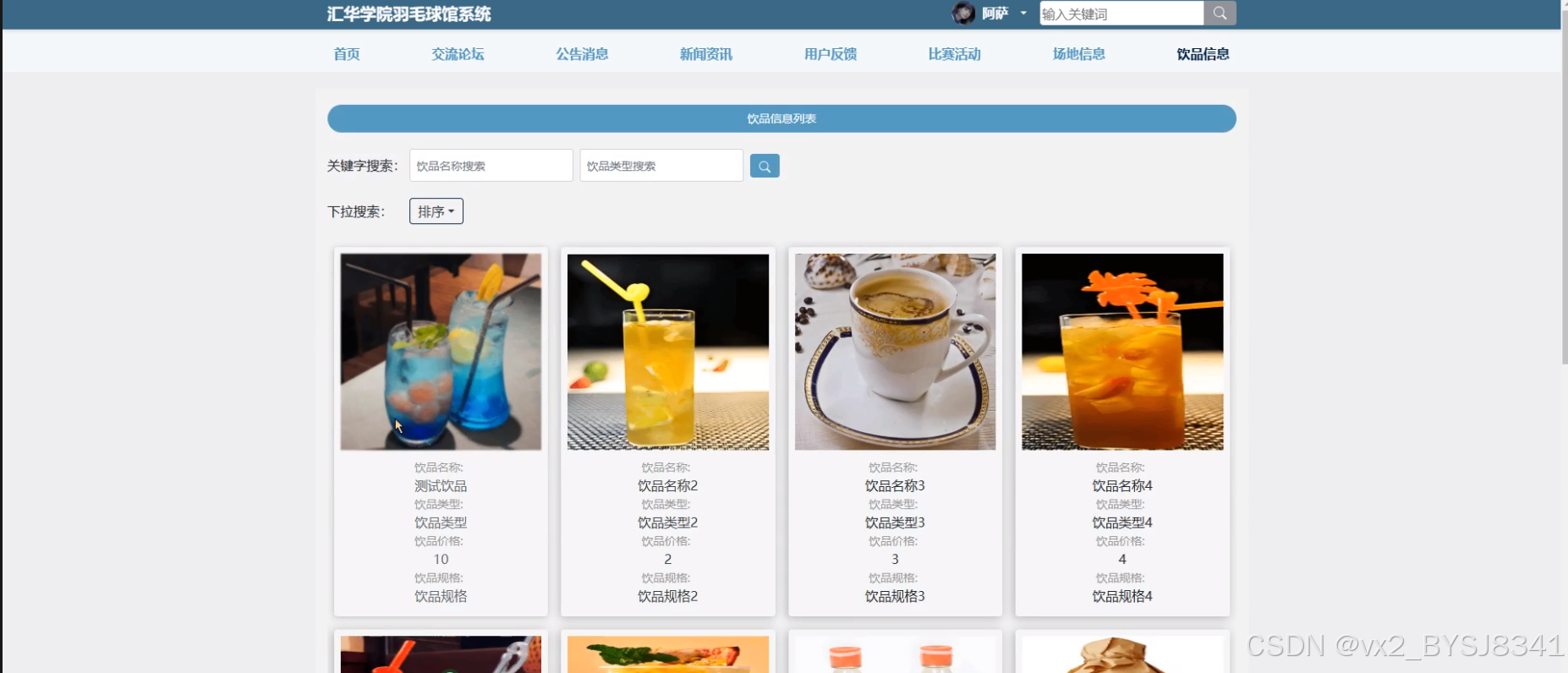 - 饮品信息管理:管理员可以添加饮品信息,可以对已有的饮品信息进行查询、重置和删除操作。