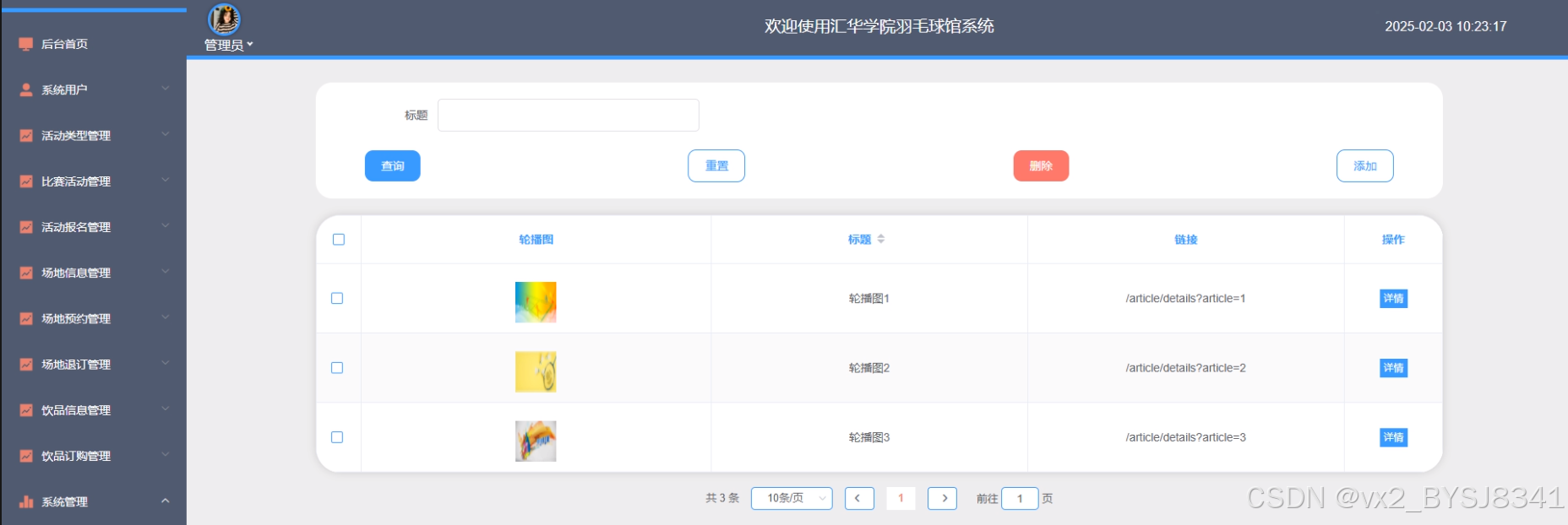 - 系统管理:在系统管理界面管理员对系统轮播图进行增删改查操作。