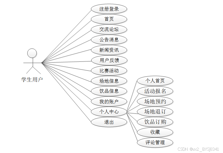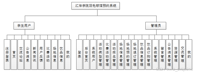 按照汇华学院羽毛球馆预约系统的角色,主要包括学生用户和管理员这两大用户功能模块,各用户功能模块的具体功能说明如下。