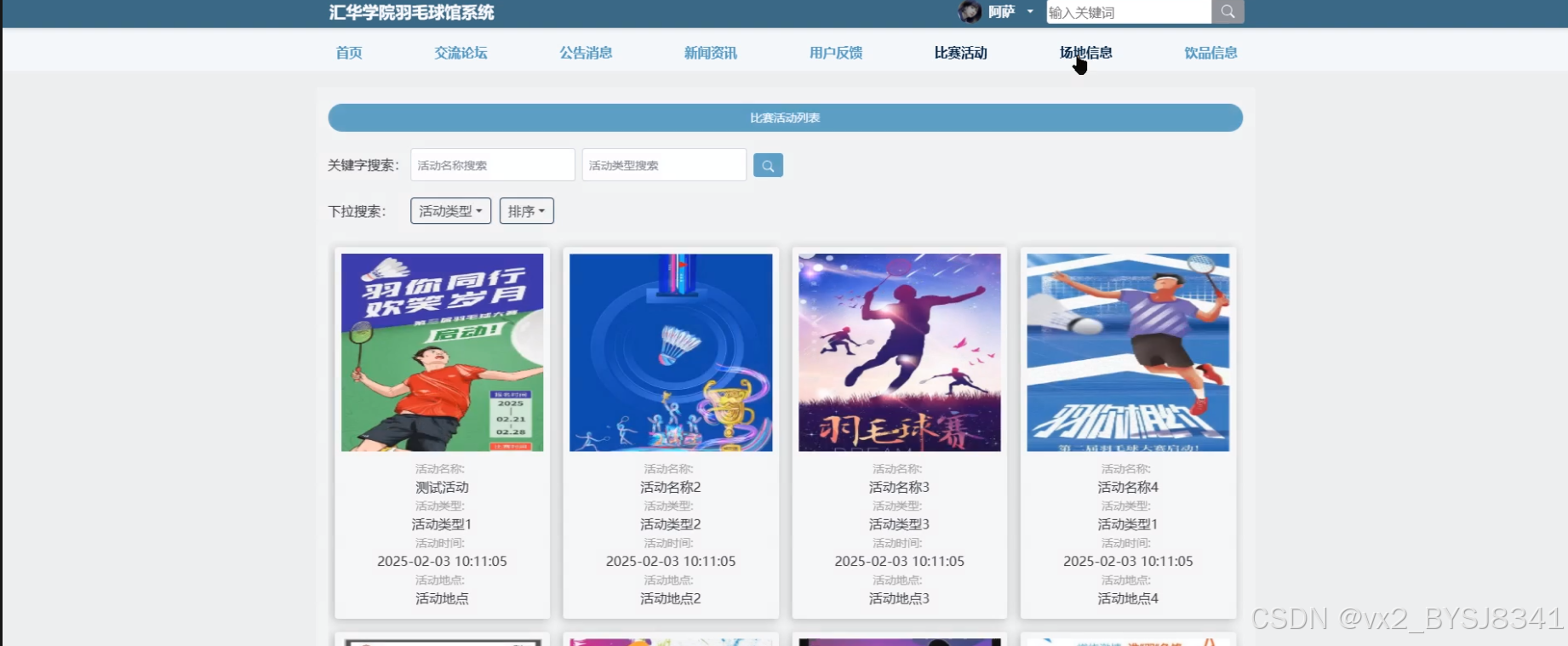 管理员则拥有强大的后台管理功能,包括对用户信息、活动类型、比赛活动、场地预约、饮品订购等进行全面管理。管理员不仅可以添加新信息,还能对已有信息进行查询、重置和删除操作,确保系统的数据准确性和实时性。此外,管理员还可以审核用户提交的比赛活动报名、场地预约申请以及处理用户的留言反馈,保证服务质量和用户满意度。