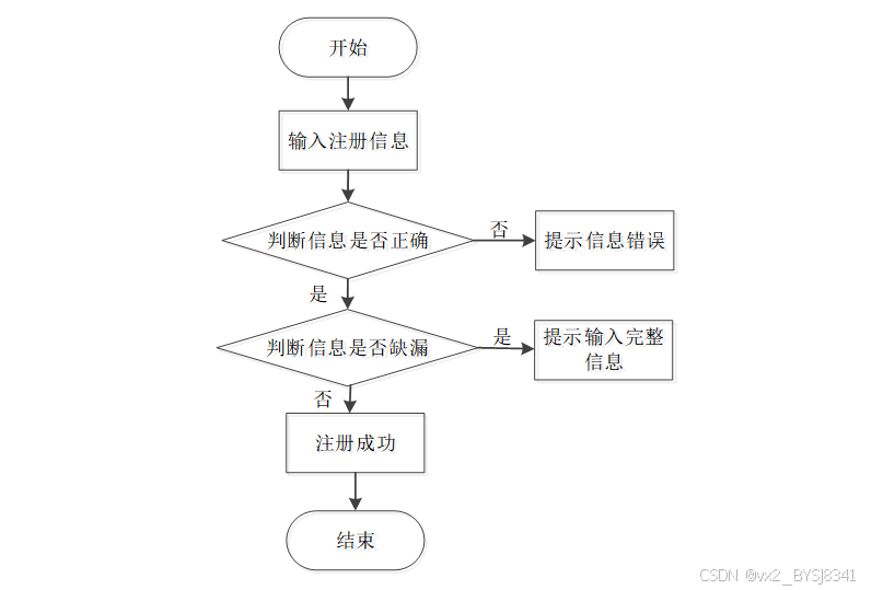 未有账号的用户可进入注册界面进行注册操作,填写注册表格,包括用户名、密码、姓名等必要信息。后台系统验证并保存用户提交的信息。分配唯一用户标识符。注册成功后,用户可以使用账号密码进行登录。用户注册流程图如下图2-5所示。