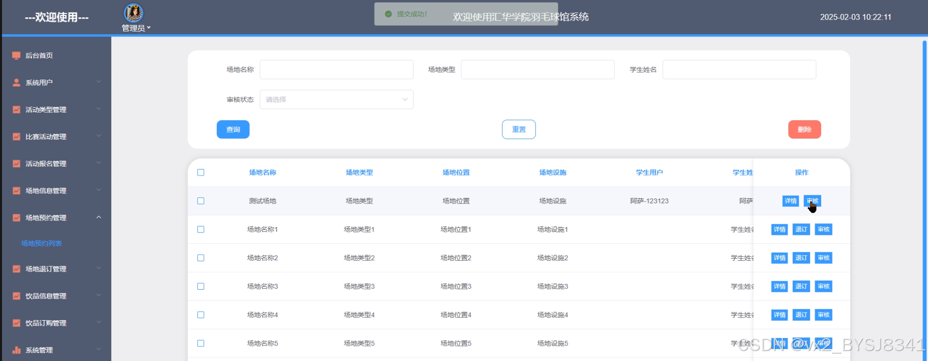 - 场地预约管理:管理员可以查看场地预约列表中某个用户提交的场地预约详情,点击“审核”可以对用户预约申请进行审核和回复,可以对列表信息进行查询、重置和删除操作。