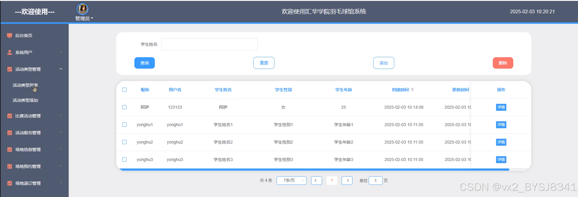Administrators have powerful backend management functions, including comprehensive management of user information, activity types, competition activities, venue reservations, beverage orders, and more. Administrators can not only add new information, but also query, reset, and delete existing information to ensure the accuracy and real-time performance of the system's data. In addition, administrators can also review user submitted applications for competition activities, venue reservations, and handle user feedback to ensure service quality and user satisfaction.