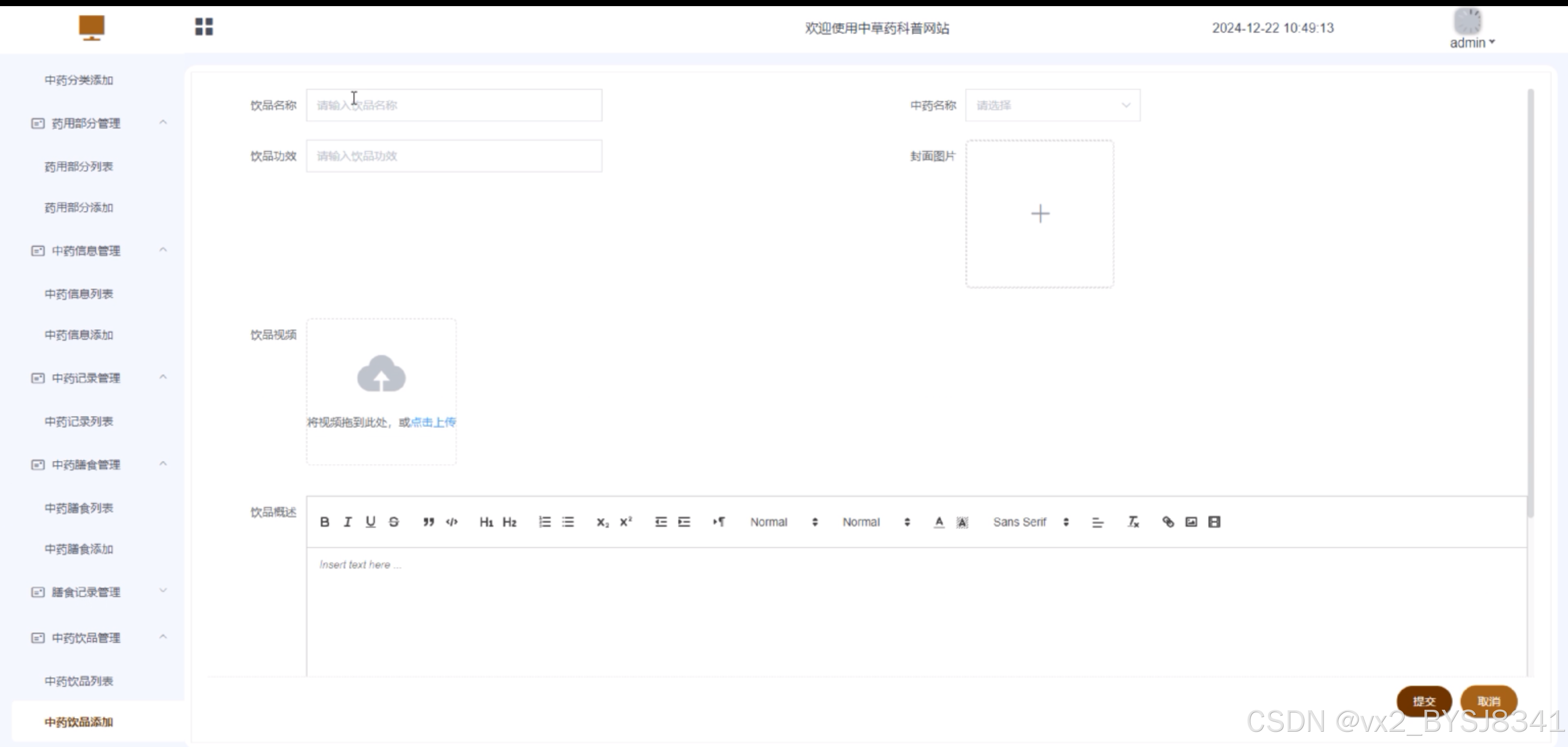 (9)中药饮品管理:中药饮品管理包含中药饮品列表和中药饮品添加;点击“中药饮品添加”可填写相关信息,包括饮品名称、中药名称、饮品功效、封面图片、饮品视频和饮品概述,同时可对饮品信息进行增删改查。