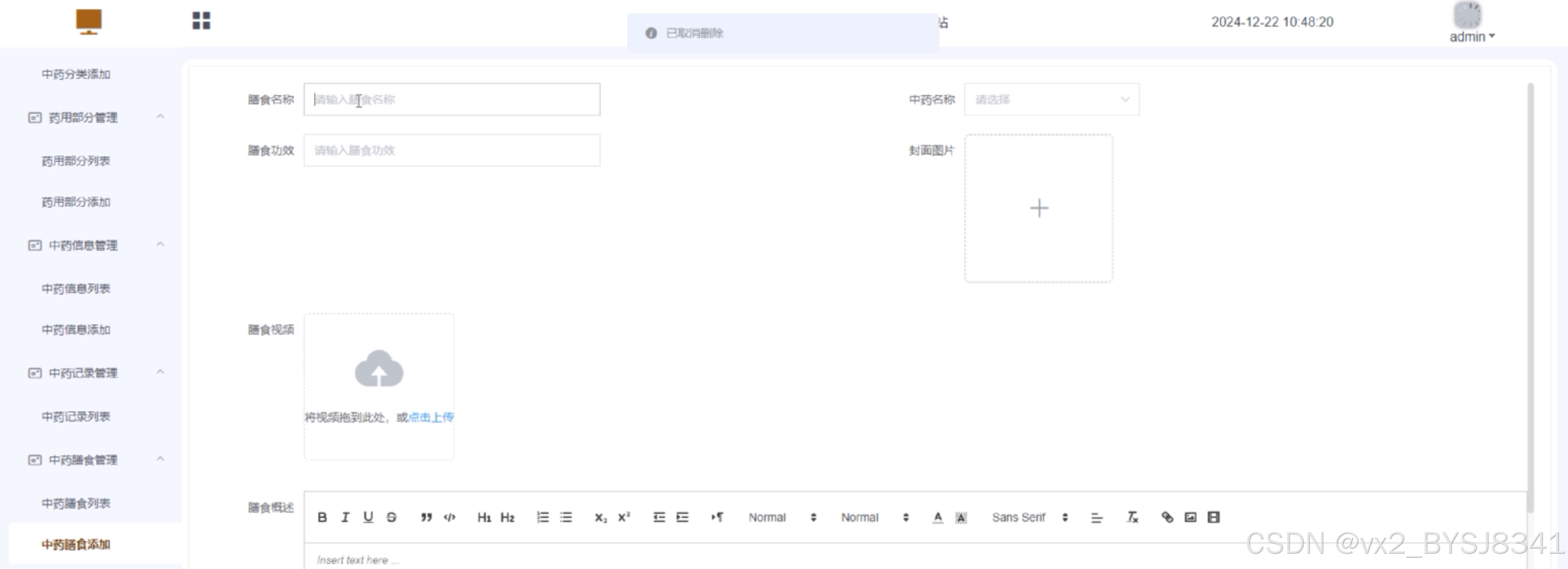 中药膳食管理:中药膳食管理包括中药膳食列表和中药膳食添加;点击“中药膳食添加”可填写相关信息,包括膳食名称、中药名称、膳食功效、封面图片、膳食视频和膳食概述,同时可对膳食信息进行增删改查。界面图如下。