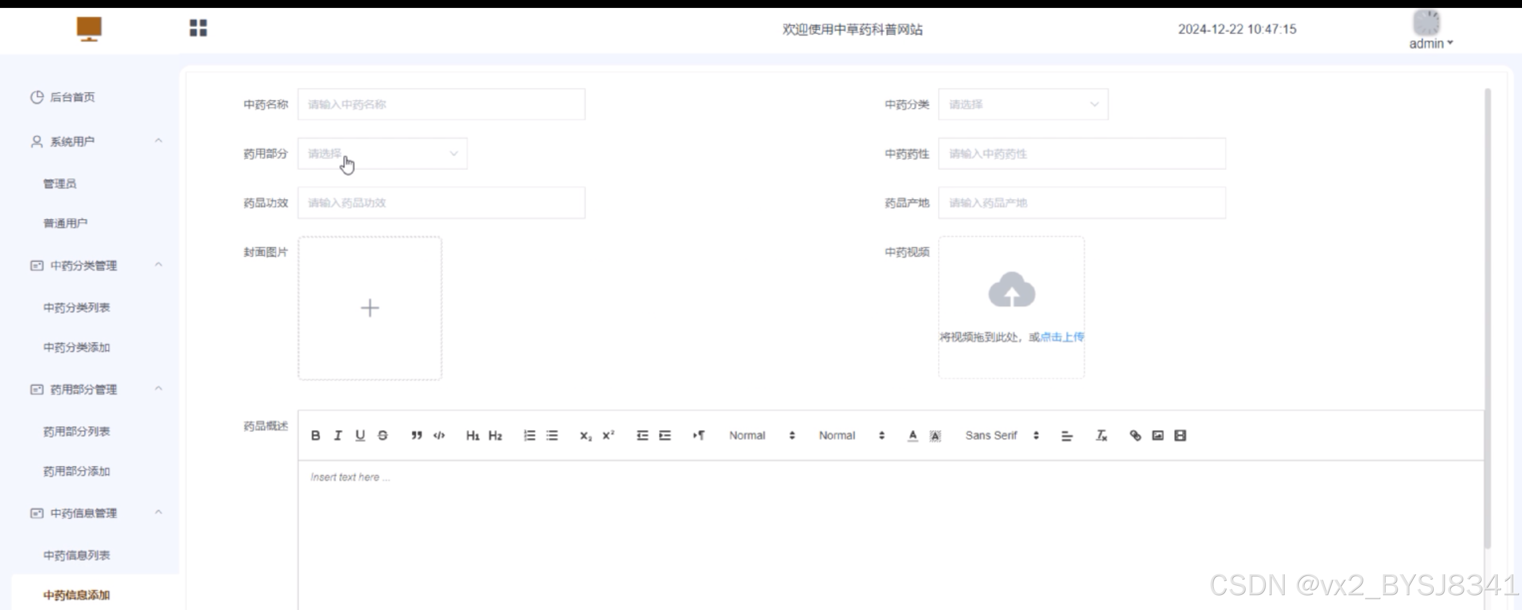 中药信息管理:中药信息管理包含中药信息列表和中药信息添加;点击“中药信息添加”可填写相关信息,包括中药名称、中药分类、药用部分、中药药性、药品功效、药品产地、封面图片、中药视频和药品概述。同时可对中药信息进行增删改查。界面图如下。