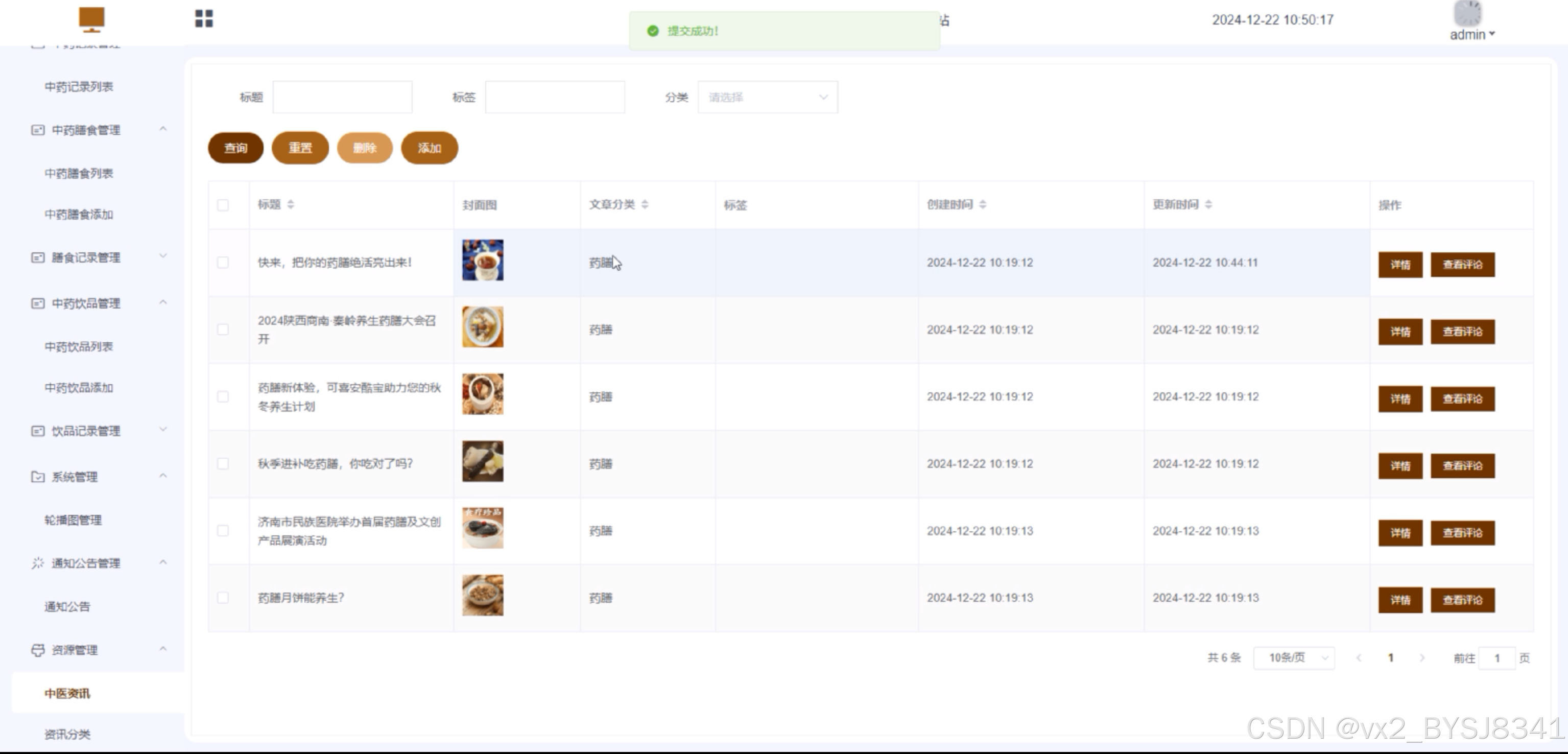 资源管理:管理员点击可查看中药咨讯和咨讯分类;如需添加新的资讯,点击“添加”按钮,上传封面图,输入标题,选择分类,输入标签、描述和正文,点击“确认”按钮进行添加。同时可对咨讯和分类进行增删改查。界面图如下。