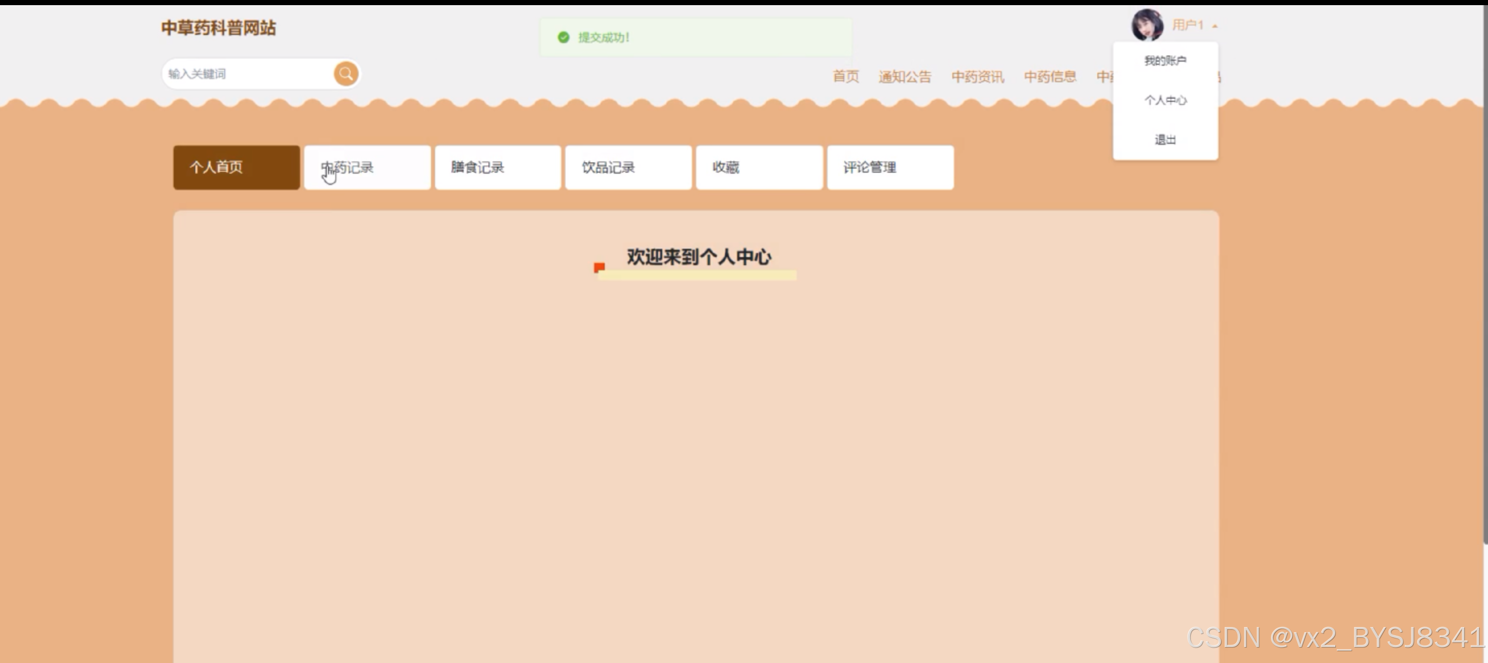 个人中心:个人中心包含多个功能模块,如个人首页、中药记录、膳食记录、饮品记录、收藏和评论管理。用户点击可对各个功能模块进行查看和管理。界面图如下。