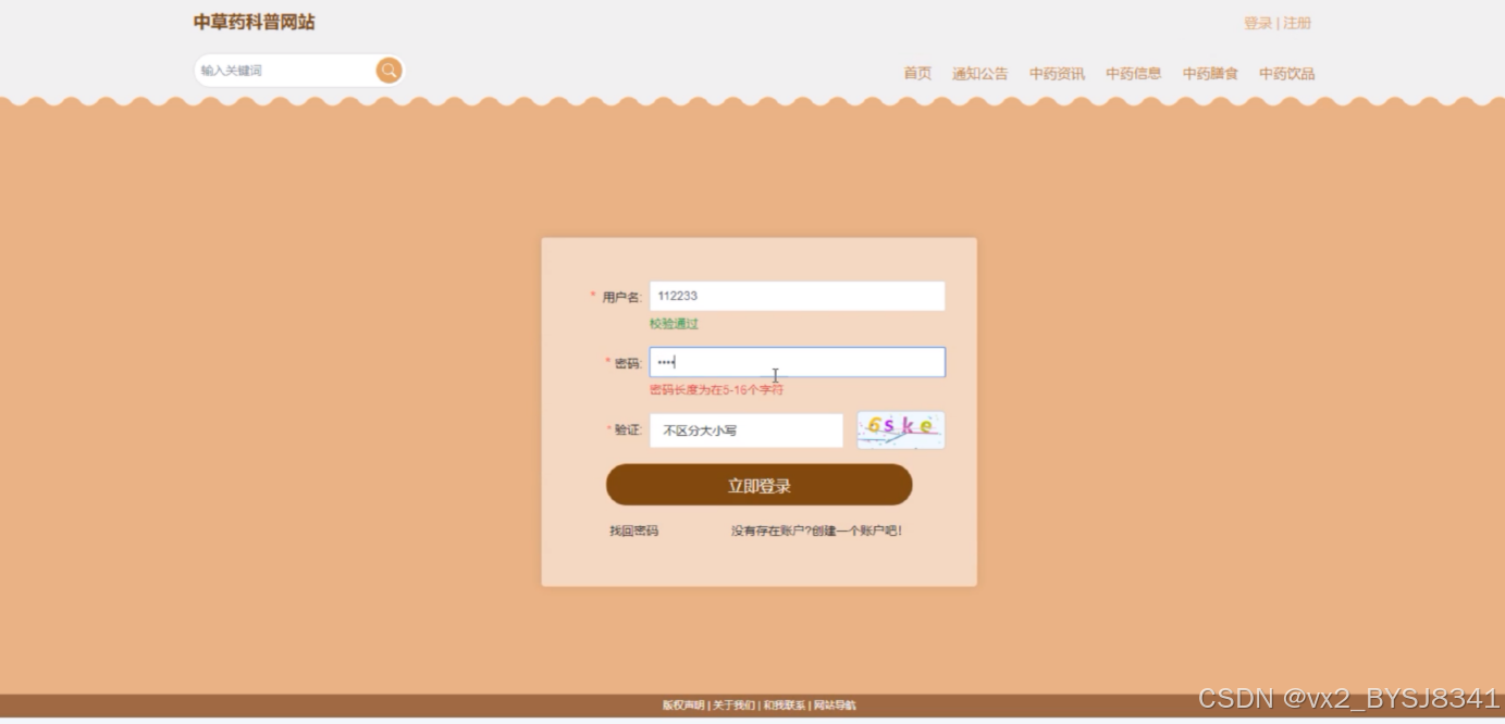 | 登录模块测试 | 登录失败的情况 | 使用者可以通过浏览器进入到中草药科普网站登录界面,输入用户名:admin和密码111,完成滑动拼图验证后,点击“登录”按钮。 | 系统提示“用户名和密码不匹配” | 正确 |