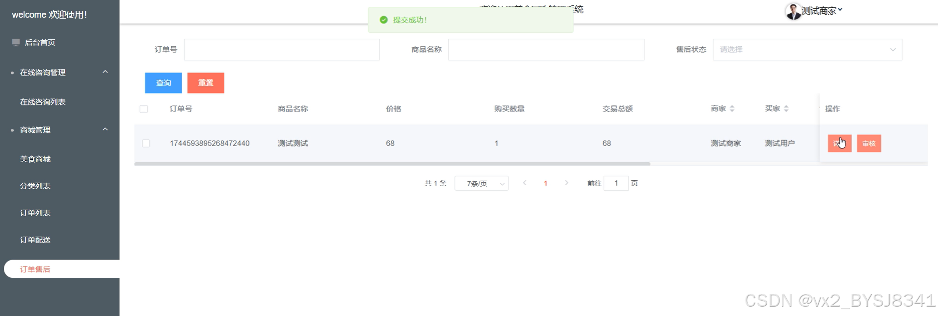 商城管理包含美食商城、分类列表、订单列表、订单配送、订单售后等子功能。