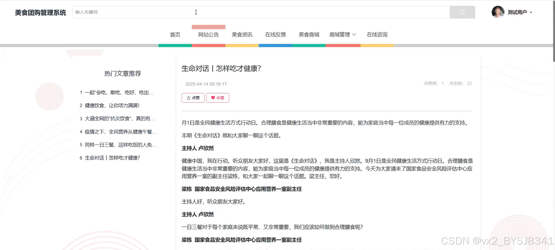 提供丰富的美食相关资讯,如美食文化、烹饪技巧、新品推荐等。用户可以在这里拓宽美食知识,发现新的美食选择。资讯内容定期更新,保持新鲜感,满足用户对美食信息的个性化需求,增加用户对系统的粘性。其界面图如下。
