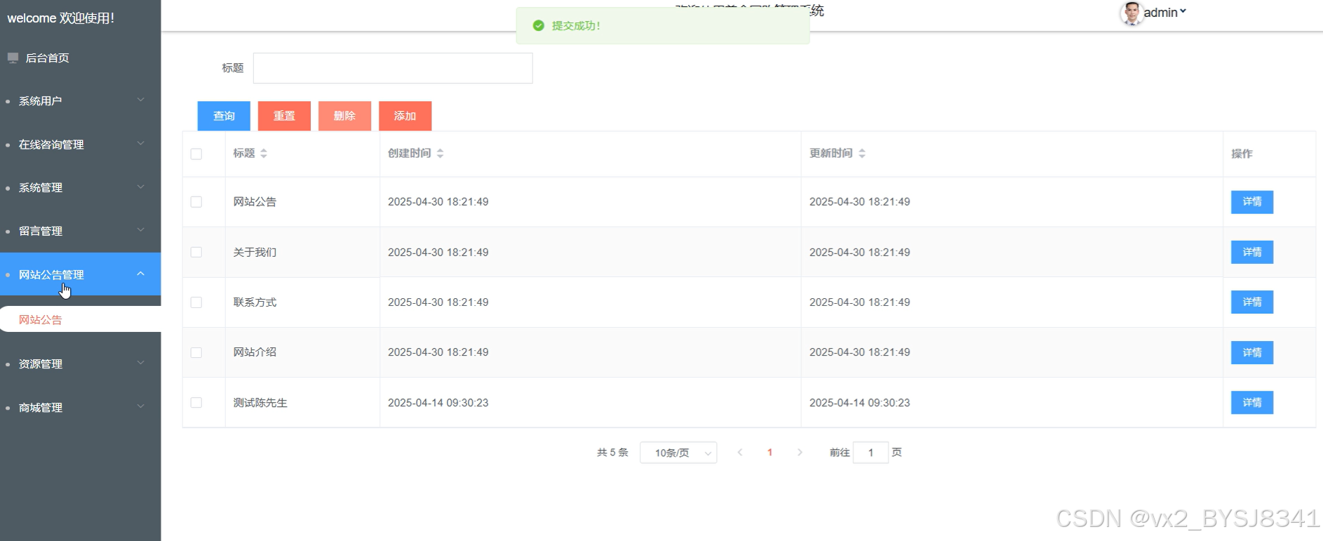 网站公告管理功能让管理员能够发布和管理网站的公告信息。管理员可以发布最新的活动信息、系统维护通知等,确保用户能够及时了解网站的动态。其界面图如下。