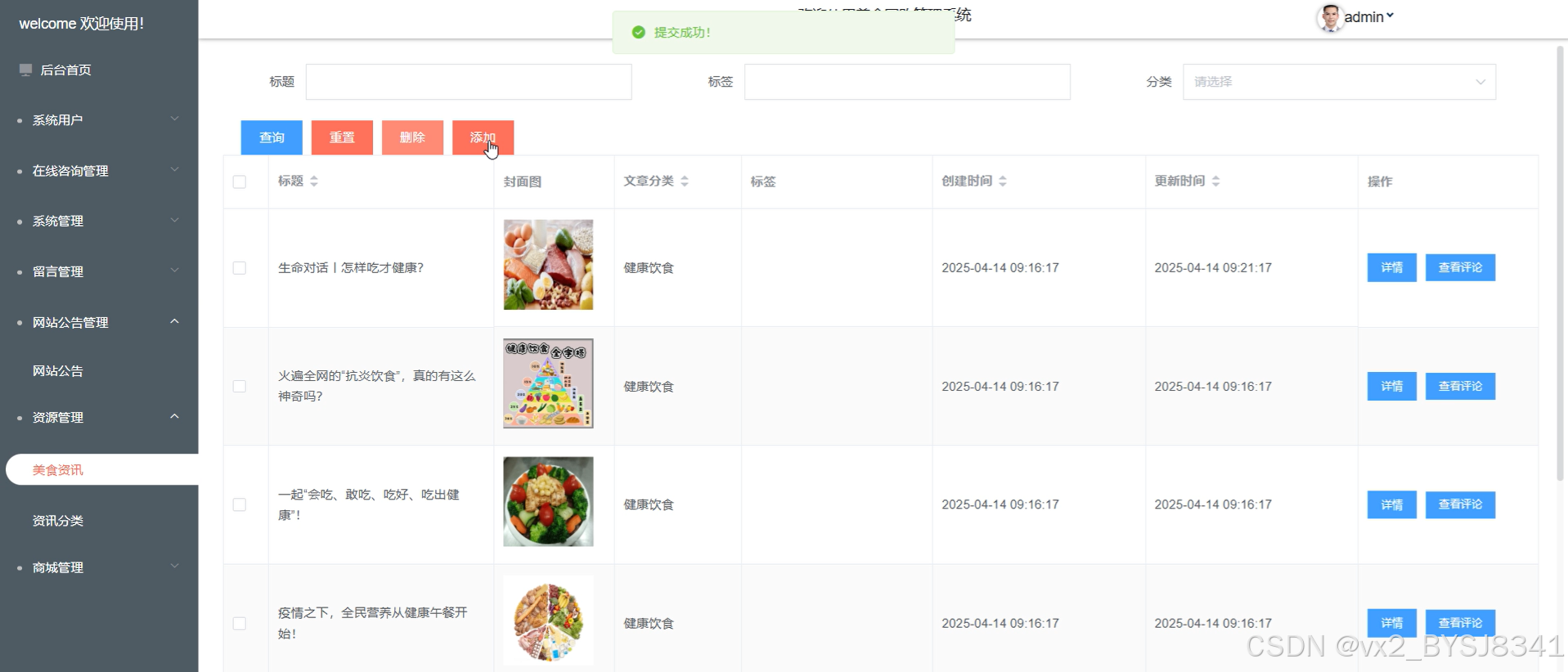 管理员负责审核和发布美食资讯,确保资讯内容的真实性和准确性。同时,对资讯进行分类和排序,提升资讯的展示效果,为用户提供有价值的信息。其界面图如下。