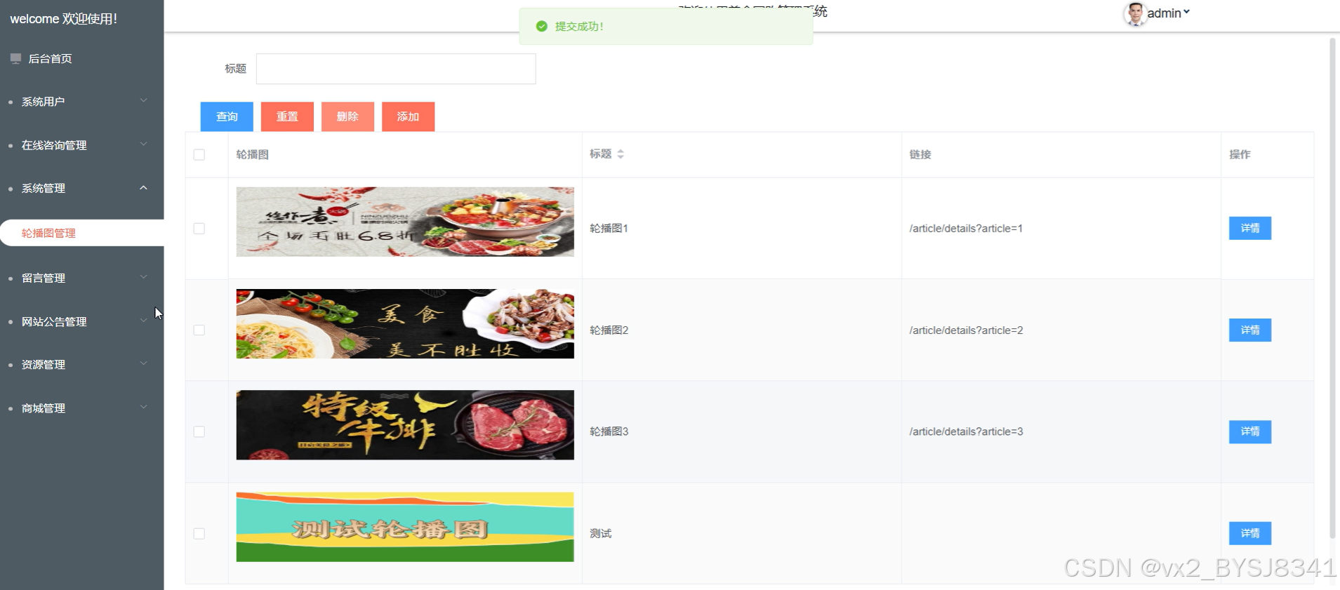 系统管理:管理平台首页的轮播图内容,包括图片的上传、删除、排序等操作,用于展示平台的重点活动、热门商品等信息。