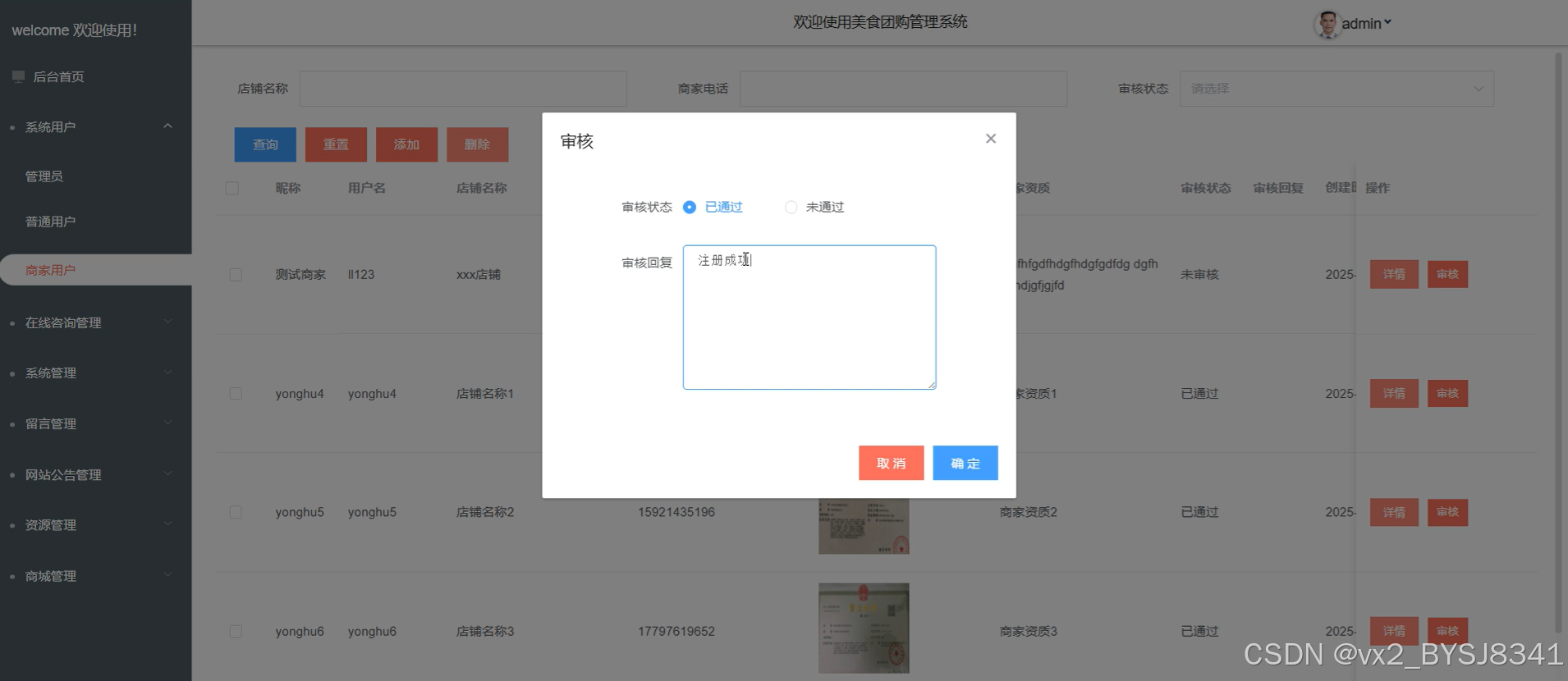 管理员负责管理系统中的所有用户,包括普通用户和商家用户。可查看用户的详细信息、审核商家用户注册申请、封禁违规用户等,确保系统用户的合法性和规范性。其界面图如下。