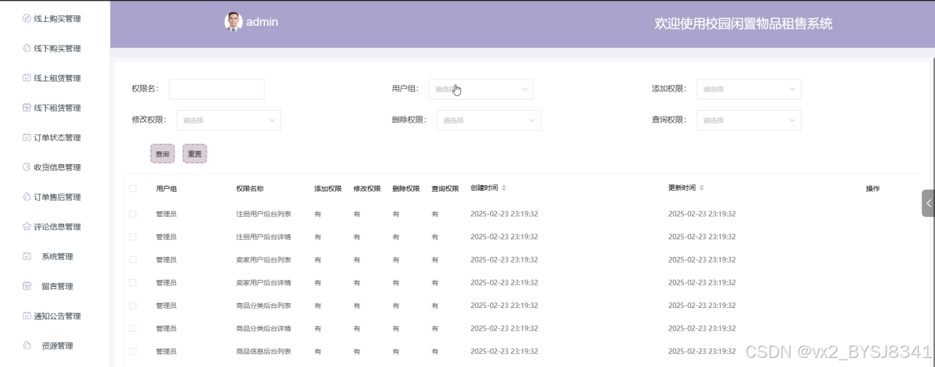 在该模块管理员对系统用户权限进行全面管控。管理员可以对不同的用户角色在访问系统时设置不同的访问权限,避免用户使用超出自己权限的功能,管理员可以对用户权限进行增删改查操作。其界面图如下图5.18所示。