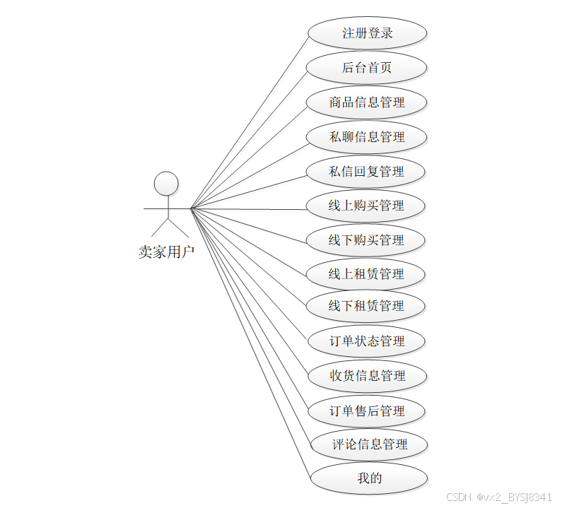 The core user function focuses on simplifying the shopping experience for users and the product management process for sellers. For ordinary users, the system provides a one-stop service from registration and login to viewing product details, making online or offline purchases and rentals, and supports interactive operations such as liking, bookmarking, rating, and commenting. In addition, users can access mall information, submit complaints and feedback, manage personal information, and more. Seller users enjoy more comprehensive product information management and order status tracking functions, including adding new products, replying to buyer private messages, managing order after-sales, etc. All operations must be reviewed by administrators to ensure security and compliance. Administrators have the highest authority and are responsible for the overall maintenance of the system, including but not limited to user role management, product classification and information review, handling complaints and feedback, and issuing notices and announcements, ensuring the stability of system operation and the security of information.