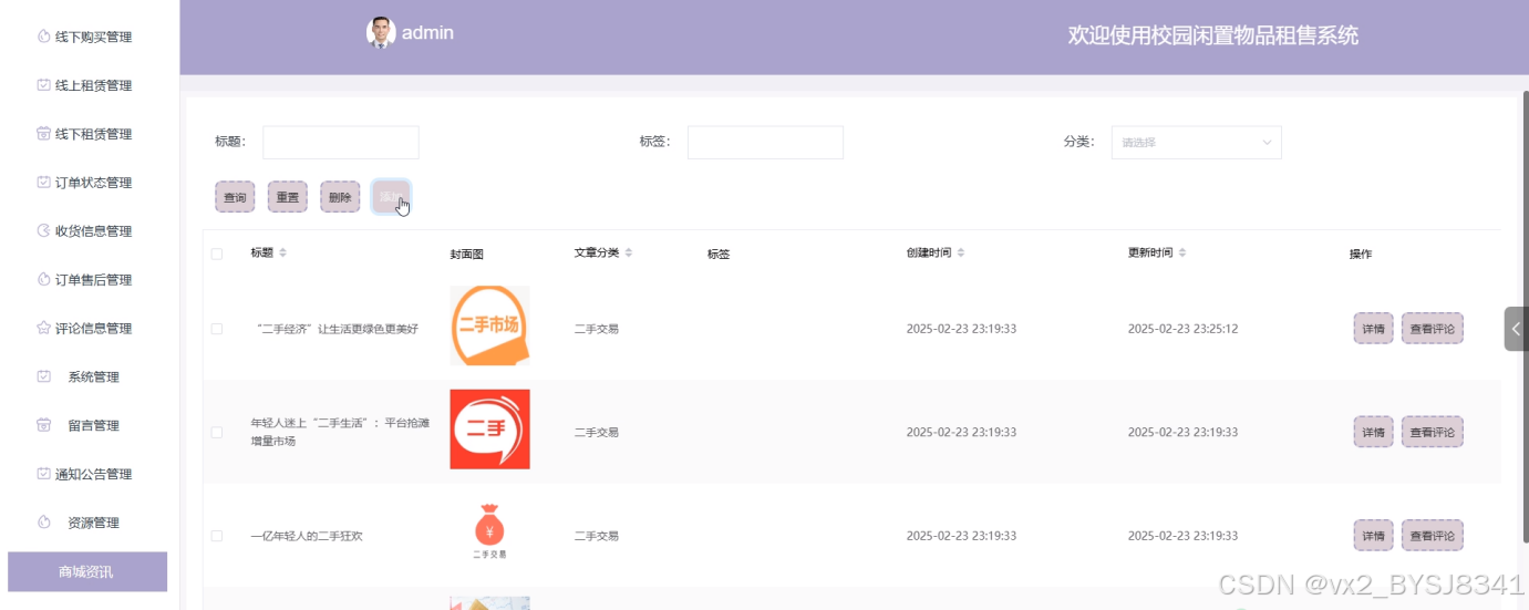 在该模块管理员可以对商城资讯和资讯分类信息进行增删改查操作。例如,点击“商城资讯”进入页面后,管理员可以通过点击某条资讯后的“详情”按钮查看该资讯的具体内容,或通过“查看评论”按钮浏览用户对该资讯的评论。以商城资讯为例,其界面图如下图5.17所示。