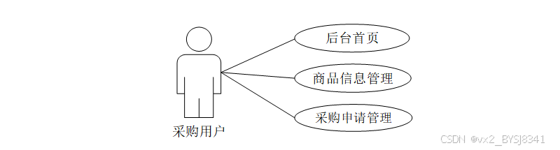 采购用户在库存管理系统中主要负责商品的采购申请和供应商管理。通过系统,采购用户可以发起采购申请、填写商品信息与数量,并查看采购状态。同时,采购用户能够查询商品信息和库存状态,确保物资的及时补充与采购流程的顺畅。采购用户用例图如下所示。