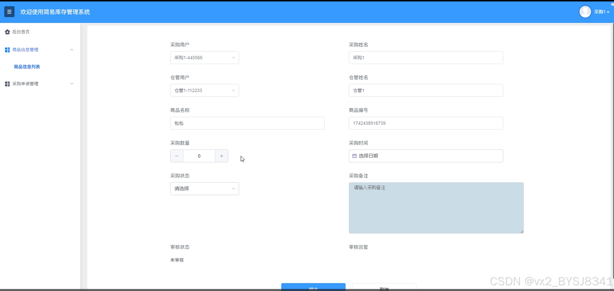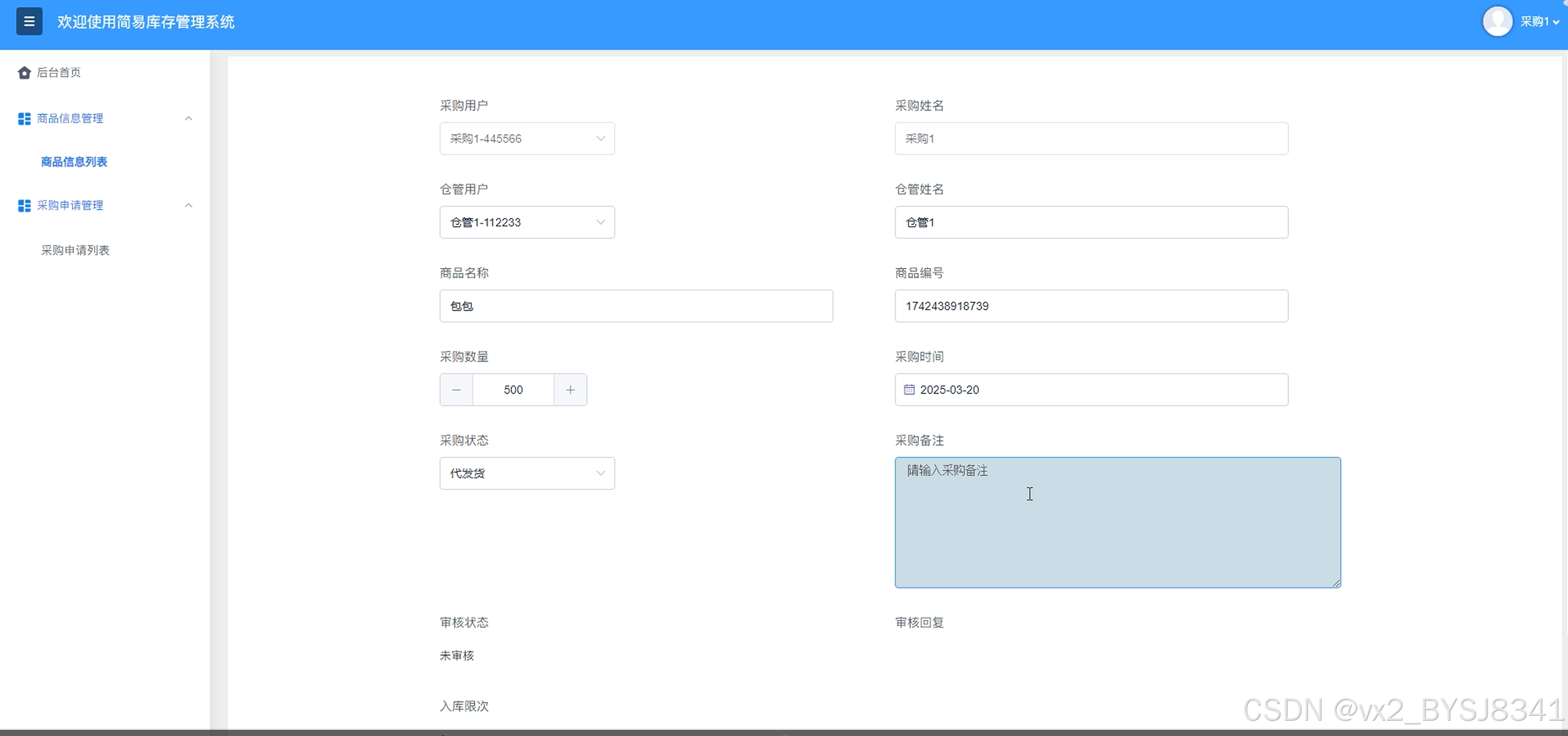 - 采购申请管理:查看采购用户提交的申请单,核实到货信息,为后续入库做准备。