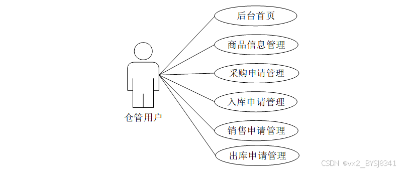 仓管用户在库存管理流程中扮演着承上启下的重要角色,主要负责商品的入库与出库操作,同时协助处理与采购、销售相关的物流环节。其工作直接关系到库存数据的准确性与流转效率,因此系统需为其设计覆盖采购申请、销售申请、库存更新等操作的功能模块。仓管用户用例图如下所示。