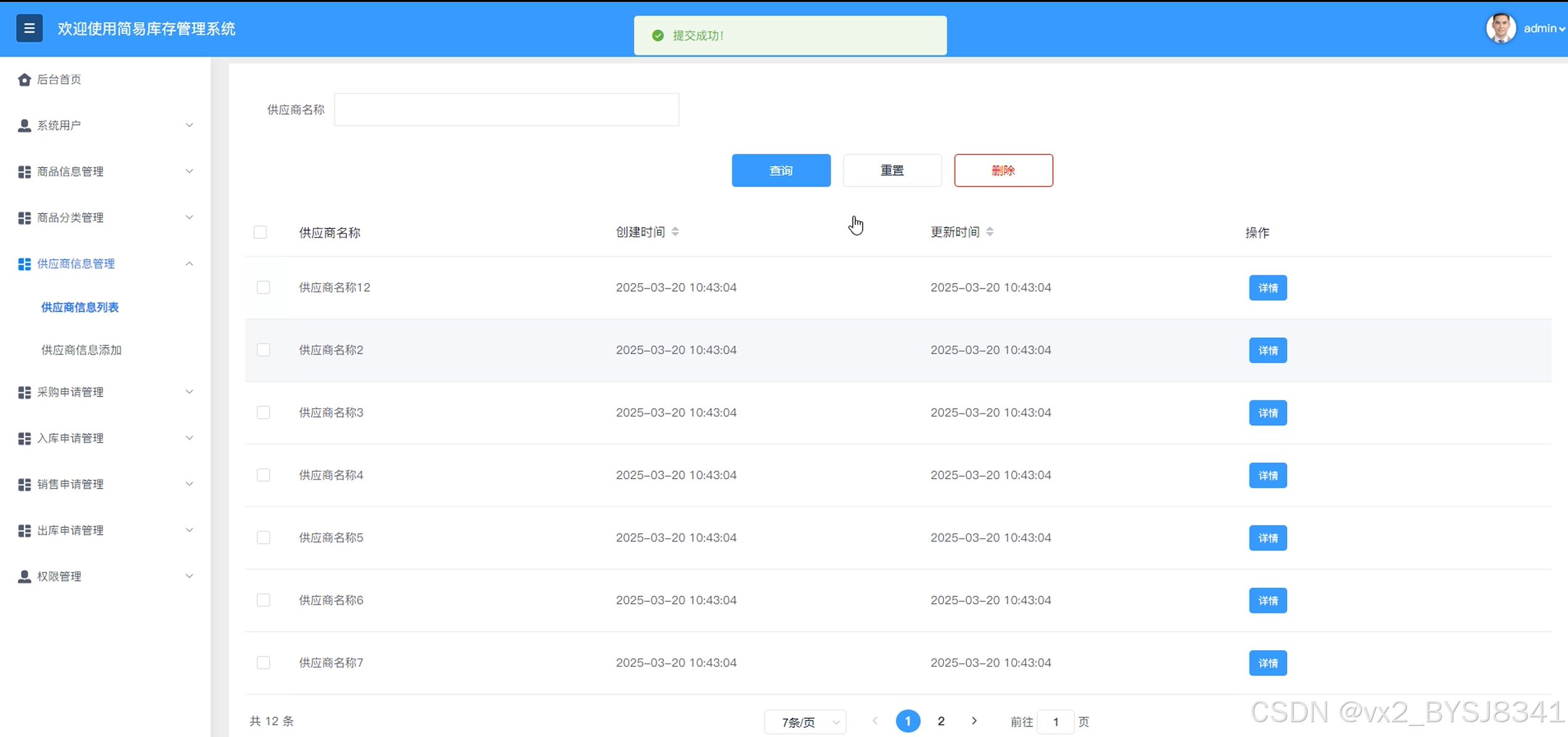 管理员的供应商信息管理界面用于集中管理系统中的所有供应商资料,展示了供应商名称、创建时间、更新时间等基本信息。管理员可通过查询、添加、编辑或删除操作,维护供应商数据的完整性与准确性,保障采购流程的有序进行。界面如下图所示。