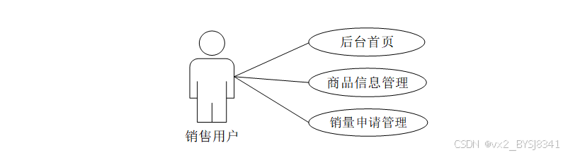 销售用户在系统中主要负责发起和管理销售申请。销售用户通过系统查看商品信息、发起销售申请并跟踪销售状态。其任务包括选择商品、填写销售数量、查看库存状况并提交销售订单。销售用户还可以查看自己的销售记录与状态,确保销售流程的顺畅。用户用例图如下所示。