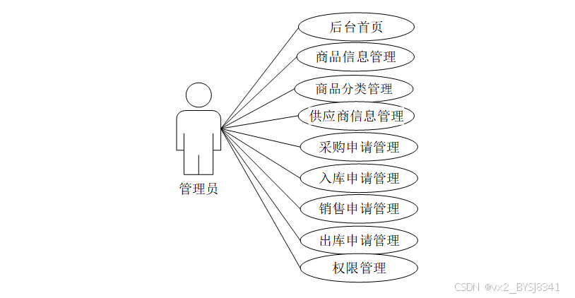 管理员在库存管理系统中具有最高权限,负责系统的整体管理与维护。其主要任务包括管理用户账户、设置用户角色与权限、审核各类申请(如采购、销售、入库和出库),并进行商品信息、分类、供应商等数据的维护。管理员还负责监控系统运行状态,通过后台首页查看整体数据,如库存、订单和用户活动等。系统需要为管理员提供全面的权限控制和操作审核功能,以确保数据的安全性和系统的高效运行。管理员用例图如下图所示。