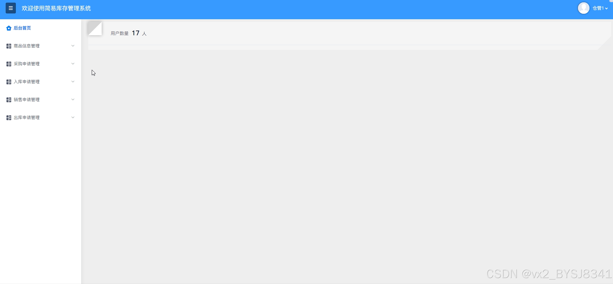 仓管用户首页界面是仓库管理人员操作系统的起始页面,集成了商品信息管理、采购申请、入库、销售及出库申请等核心功能模块,方便用户快速进入各类业务操作,提升仓储流程的管理效率与执行便捷性。界面如下图所示。