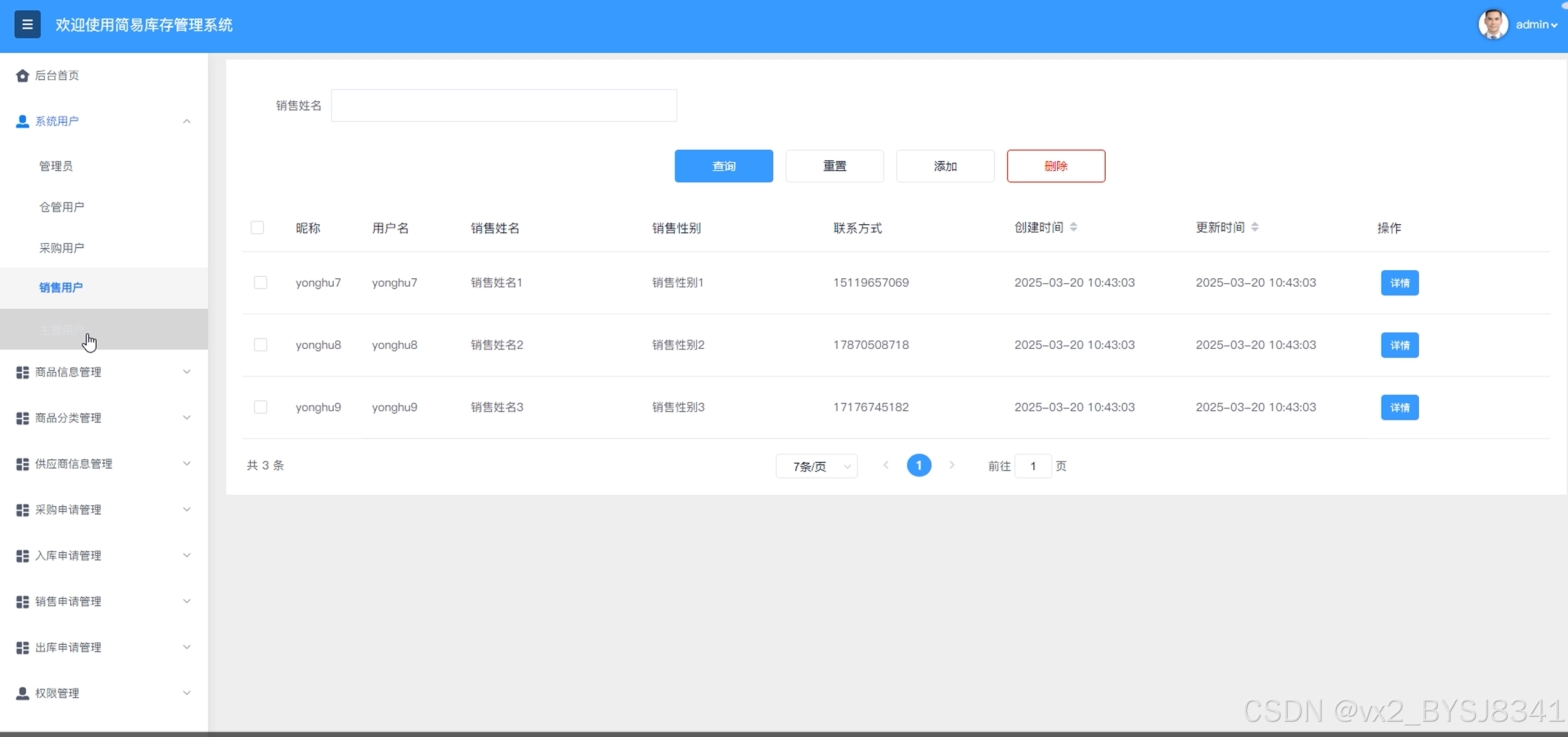 系统用户界面是管理员用于管理平台内各类用户信息的功能页面,包括销售用户、采购用户、仓库用户等。在该界面中,管理员可以查看用户基本信息、联系方式、创建和更新时间,并支持添加、查询、编辑或删除用户数据,方便进行人员管理和权限控制。界面如下图所示。