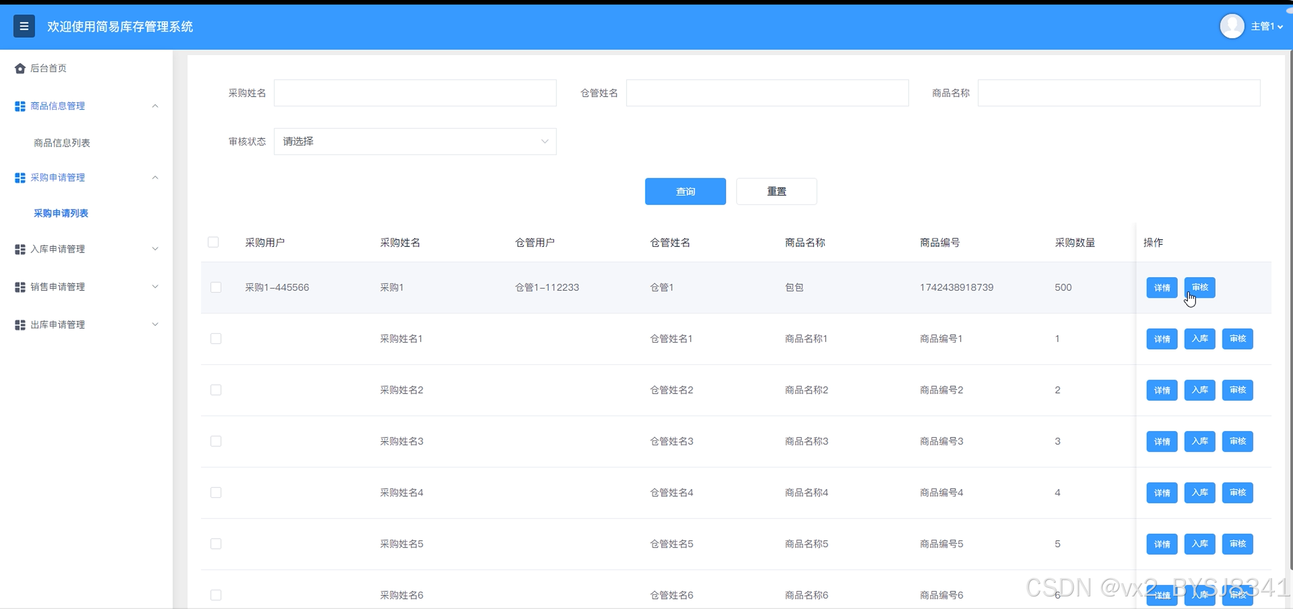 主管用户的采购申请管理界面用于对所有采购人员提交的采购申请进行集中审核与处理。界面列出了每条申请的采购用户、商品信息、数量、仓管负责人等详细内容,主管可根据需求点击“详情”查看申请具体内容,或直接进行“审核”或“入库”操作,实现对采购流程的有效监管与流转控制。界面如下图所示。