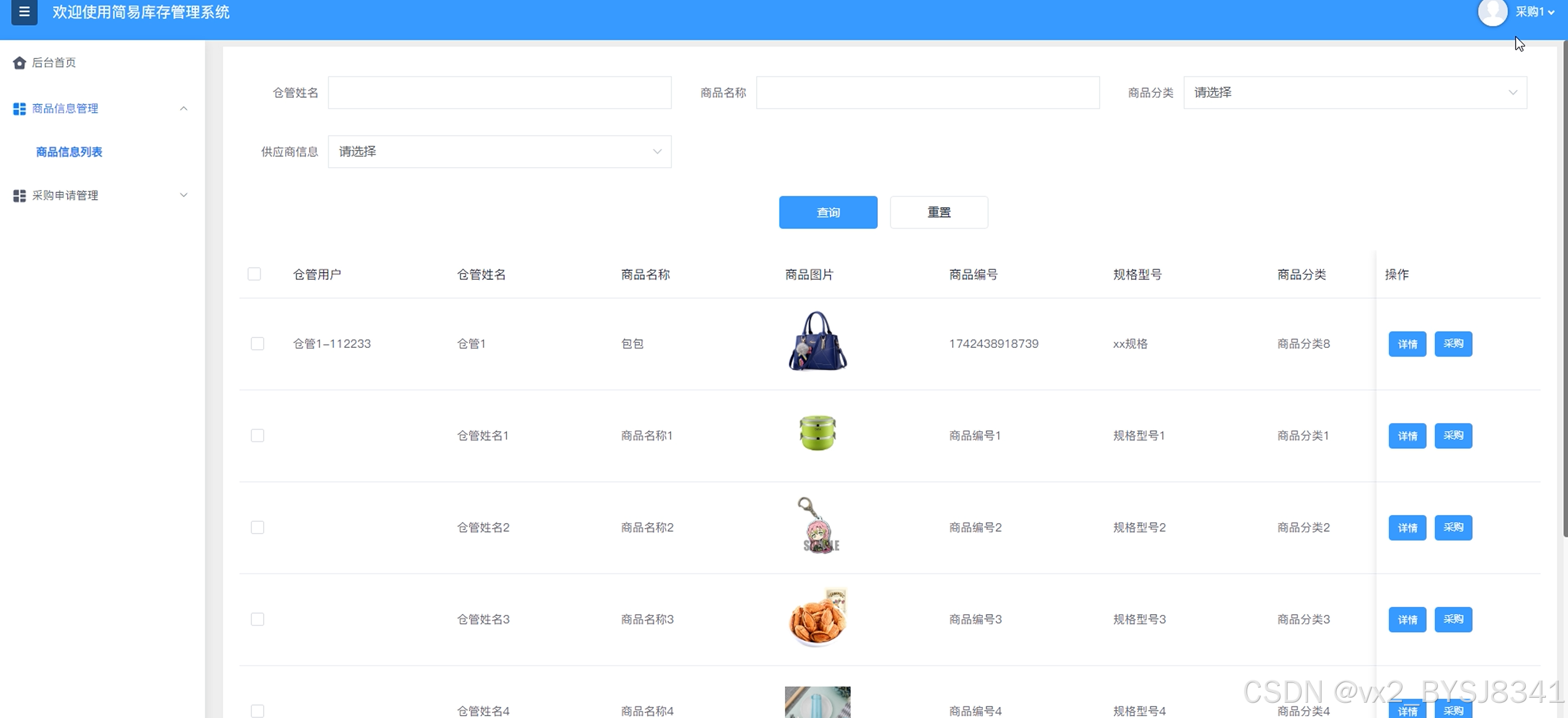 采购用户的商品信息管理界面用于查看和筛选仓库中的商品详情,包括商品名称、图片、编号、分类等信息,并可直接发起采购操作。界面如下图所示。