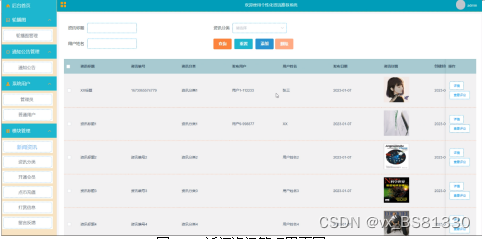 新闻资讯管理,在新闻资讯管理页面中可以对索引、资讯标题、资讯编号、资讯分类、发布用户、用户姓名、发布日期、资讯封面等信息,根据详情查看评论进行添加或删除等操作,如图5-11所示。