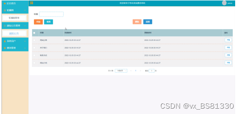 通知公告管理,在通知公告管理页面中可以对索引、标题等信息进行详情、查询、删除等详细操作,如图5-12所示。