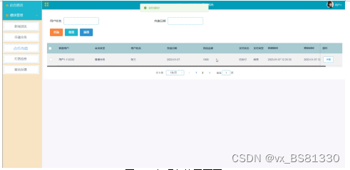 点币充值,在点币充值页面中通过填写普通用户、会员类型、用户姓名、充值日期、充值金额、支付状态、支付类型等信息,根据详情进行添加、查询等操作,如图5-7所示。