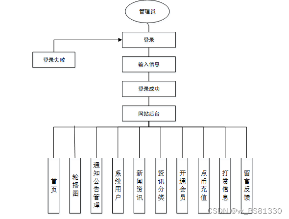 (1)功能要求:可以管理后台首页、轮播图(轮播图管理)、通知公告管理(通知公告)、系统用户(管理员、普通用户)、模块管理(新闻资讯、资讯分类、开通会员、点币充值、打赏信息、留言反馈)等功能模块。