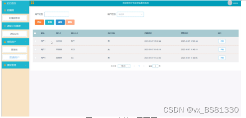 用户管理,在用户管理页面中可以对索引、昵称、用户名、用户姓名、用户性别等信息进行详情、添加或删除等详细操作,如图5-13所示。