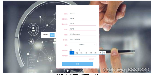 用户注册,在用户注册页面通过填写账户、设置密码、确认密码、昵称、邮箱、手机号、身份、用户姓名、用户性别等信息完成用户注册,如图5-4所示。在个人中心页面通过填写个人资料、密码修改、收藏等信息进行信息更新操作,还可以根据需要进行相应操作;如图5-5所示。