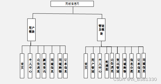 同城信息网在系统的手机上可以运行,主要实现了管理员后端;首页、个人资料、公共管理(轮播图、公告消息)用户管理(管理员、注册用户)信息管理(新闻资讯、资讯分类)同城信息、信息分类、同城信息、订单信息等主要功能模块的操作和管理。用户;公告消息、新闻资讯、同城信息、同城购物等主要功能模块的操作和管理。总体分布如图3.1所示: